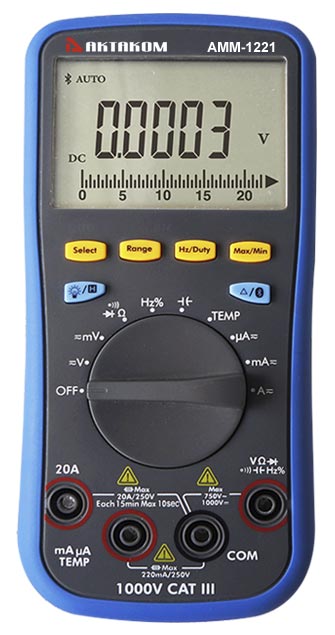 Мультиметр цифровой АКТАКОМ АММ-1221 обладает широкими функциональными возможностями и высокой точностью измерения. Возможность измерять истинные среднеквадратические значения (TrueRMS) позволяют мультиметру АММ-1221 корректно выполнять измерения несинусоидальных и искажённых сигналов. В этом приборе имеется аналоговая шкала для отслеживания быстрых изменений измеряемой величины. Кроме того, у цифрового мультиметра АММ-1221 есть функция регистратора данных, а также возможность построения трендов в графическом виде.
