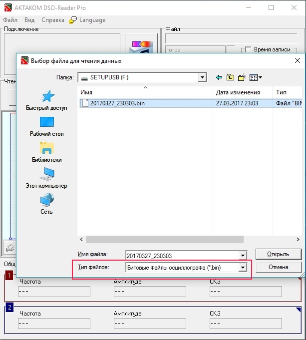 Для чтения данных, записанных осциллографом на внешний USB-носитель в формате *.bin, можно воспользоваться программным обеспечением AKTAKOM DSO-Reader Pro.