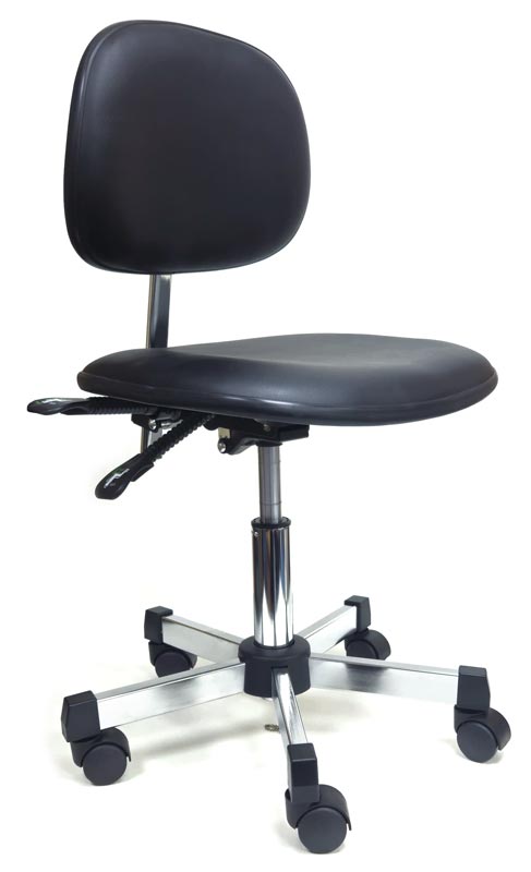 Искусственная кожа (винил). Высота регулировки стула: 430~570 мм. Размер сиденья: 440x400 мм. Размер спинки: 380x290 мм. Регулировка сиденья вверх и вниз, регулировка спинки по высоте, регулировка угла наклона спинки и сиденья. 5-ти лучевое основание без сварки из хромированной холоднокатаной стали, диаметр 520 мм; 5 колес (нейлон). Антистатическое исполнение: поверхностное и объемное сопротивление 10Е5-10Е8 Ом. Цвет черный.