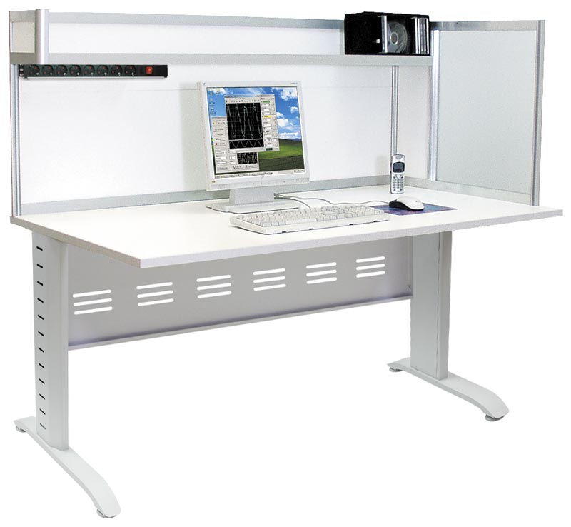 Стол инженера/менеджера антистатический (ESD). Цвет алюминиевого каркаса - серый (RAL-9006), цвет ДСП - белый. Столешница 150x80 см. Перегородка высотой 60 см правосторонняя (левосторонняя - по заказу). Одна полка 150x20 см над столешницей. Освещение из 2-х светодиодных светильников по 10 Вт. Блок из 8 розеток с выключателем. Высота 134 см. Расстояние от столешницы до пола 750 мм с регулировкой опорами +10 мм. В стандартной модификации полки фиксированы по высоте.