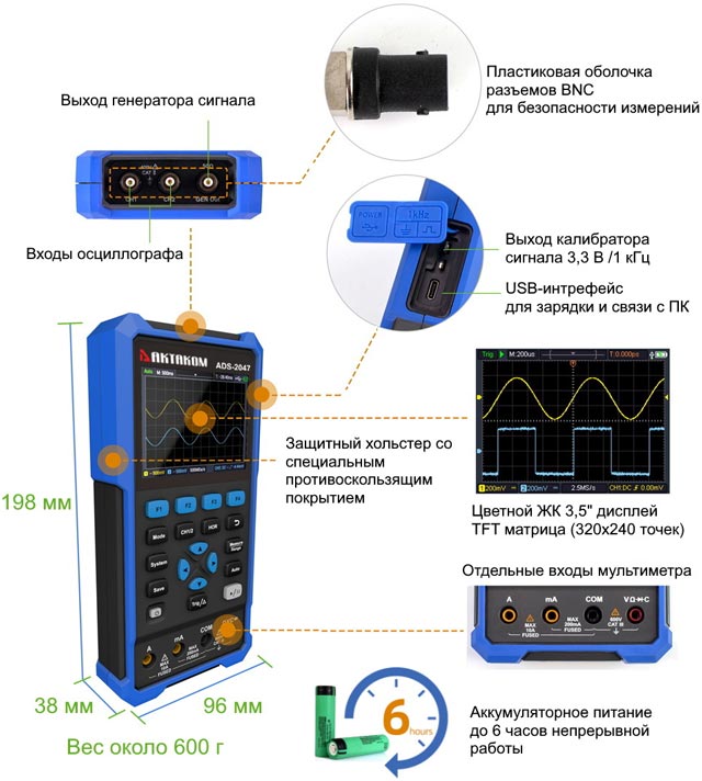 Цифровой осциллограф АКТАКОМ ADS-2046 предназначен для визуализации, измерения и анализа параметров сигналов в электрических цепях. Этот прибор создан для использования в "полевых" условиях и в ограниченном рабочем пространстве. При весьма скромных размерах ADS-2046 сочетает в себе два измерительных прибора: двухканальный цифровой осциллограф и мультиметр, способный измерять истинные среднеквадратические значения (TrueRMS), что позволяет корректно выполнять измерения несинусоидальных и искажённых сигналов.