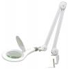 Светильник кольцевой, диаметр линзы 152 мм (6"). Увеличение 5 диоптрий. Защитная крышка. Источник освещения: 72 SMD светодиода. Максимальная мощность 12 Вт. Многофункциональный переключатель (3 кнопки) с регулятором силы света. Световой поток 880 лм. Цветовая температура 6000-7000 К. Крепление к столу струбциной. Цвет белый. Питание 220-240 В.