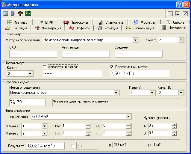 Алгоритмы, используемые для определения параметров импульсов, могут использоваться для выполнения такой распространенной задачи, как выделение из отображаемого участка сигнала целого числа периодов. Измерение амплитуды, частоты и фазового сдвигаВ программном обеспечении AKTAKOM Oscilloscope Pro Multichannel Edition существует возможность производить измерения амплитуды и частоты анализируемых сигналов. Так, например, измерения амплитуды сигнала проводятся по мгновенным значениям или по усредненным измерениям. Измерения частоты проводятся двумя способами: аппаратным и (или) программным методом. В программе так же существует возможность автоматического вычисления фазового сдвига сигнала канала B относительно канала A. Для определения величины фазового сдвига в данной программе применены 3 метода: геометрический метод, формула косинуса угла потерь, позволяющая избежать грубых ошибок геометрических методов, возникающих из-за случайных помех, искажающих форму сигнала. (Мало того, в этом случае возможно определение сдвига фаз между сигналами абсолютно различной формы), а также спектральный метод, использующий БПФ. В последнем случае, сравнение фаз идет только по основной гармонике сигналов. Пользователь может выбрать любой из этих методов.