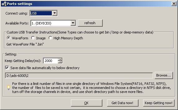 Программное обеспечение Актаком DSO-Soft 6000 позволяет сохранять полученные данные в двух форматах: графическом Bitmap *.bmp или векторном формате *.bin. Только векторный формат *.bin может быть в дальнейшем загружен и обработан в данном программном обеспечении. Формат *.bmp можно просмотреть через другое программное обеспечение, поддерживающее данный тип файла, например, графический редактор. Актаком DSO-Soft 6000 позволяет также получать данные: